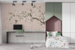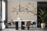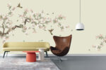Delicate birds sing on blossoming branches over a soft beige backdrop.A soothing blend of elegance and nature’s charm.