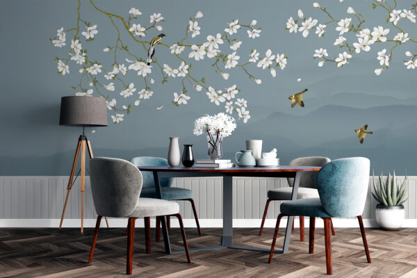 A pastel teal dream with birds and blossoms in gentle harmony.Brings freshness and charm to any space.